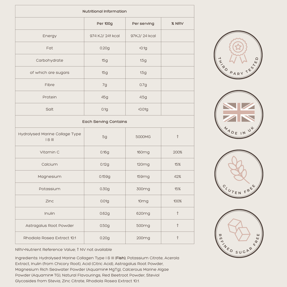 Powered by marine collagen, adaptogens, vitamins, minerals and prebiotics.